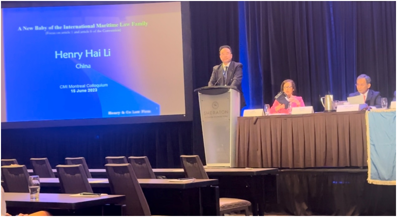 On 14-16 June 2023, the managing partner of this firm, Dr. Henry Hai Li attended the International Colloquium in Montreal Canada. As arepresentative of the China Maritime Law Association,he also attended the CMI Assembly. At the colloquium, he presented a paper entitled “A New Baby of the International Maritime Law Family”introducing the purpose and the basic rule of the UN Convention on the International Effects of the Judicial Sales of Ships.